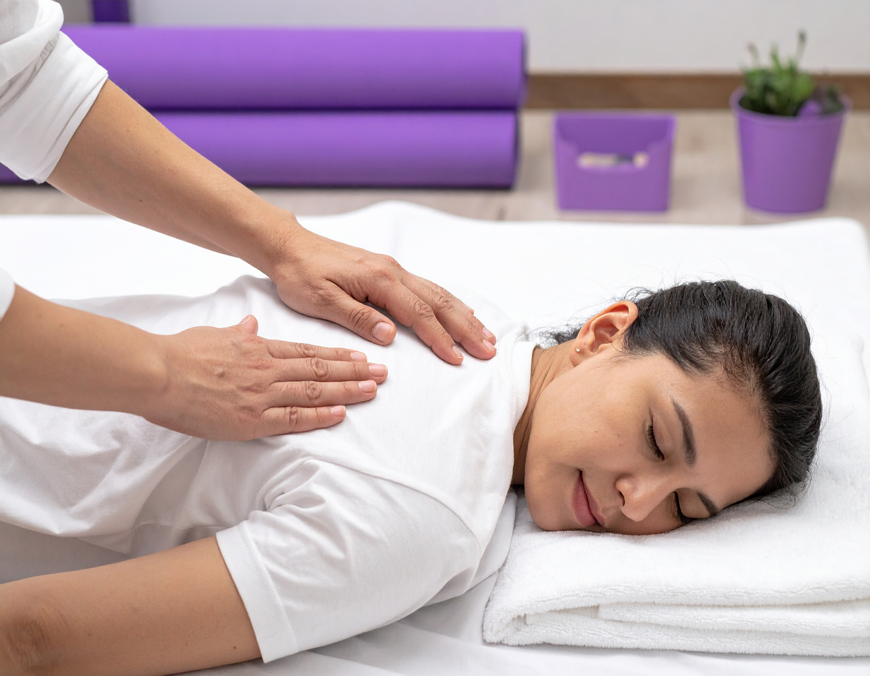 Masáž probíhá vleže na pohodlné podložce, v příjemném prostředí a v pohodlném oblečení (tričko s dlouhým rukávem a legíny).
